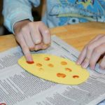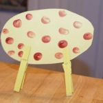 - Use your index finger and your brown paint to stamp several finger prints around the surface of the yellow oval. Allow to dry. When dry, repeat this process on the other side of the yellow oval.
