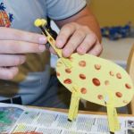 - Use your index finger and brown paint again to create brown spots on all three of the dry yellow painted clothespins.