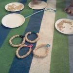 - When you have completed your cheerio filled shape, cut a segment of decorative ribbon about 8 inches long and tie it into a loop through your wire art so that you can hand it.