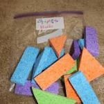 These sponge blocks are great for a younger sibling to bring along to an older sibling's activity or just about anywhere. They are fun to build and stack with and never noisy, mess or cumbersome to tote around. As an added bonus, if they get dirty, they are very easily washed and dried.