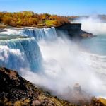 Niagara Falls, one of the most famous natural landmarks in North America, is the name for three large waterfalls on the Niagara River that are located along the border between the United States and Canada. Horseshoe