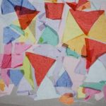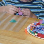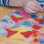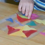 - Use your tissue paper scraps or cut your own small pieces of tissue paper and arrange the tissue paper to lay flat in a design or random pattern onto the sticky contact paper.
